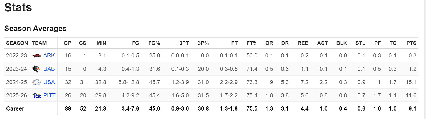 Let's look at a case study, Barry Dunning Jr., Senior Guard at Pitt. Pitt had a really bad season, 4th to last in the ACC with an overall record of 13-20. Dunning averaged 11.6 points, plays hard, brings athleticism to the floor, and is an okay shooter. Dunning will most likely not be an NBA player. Since graduating high school as the #1 player in Alabama, this has been his career: