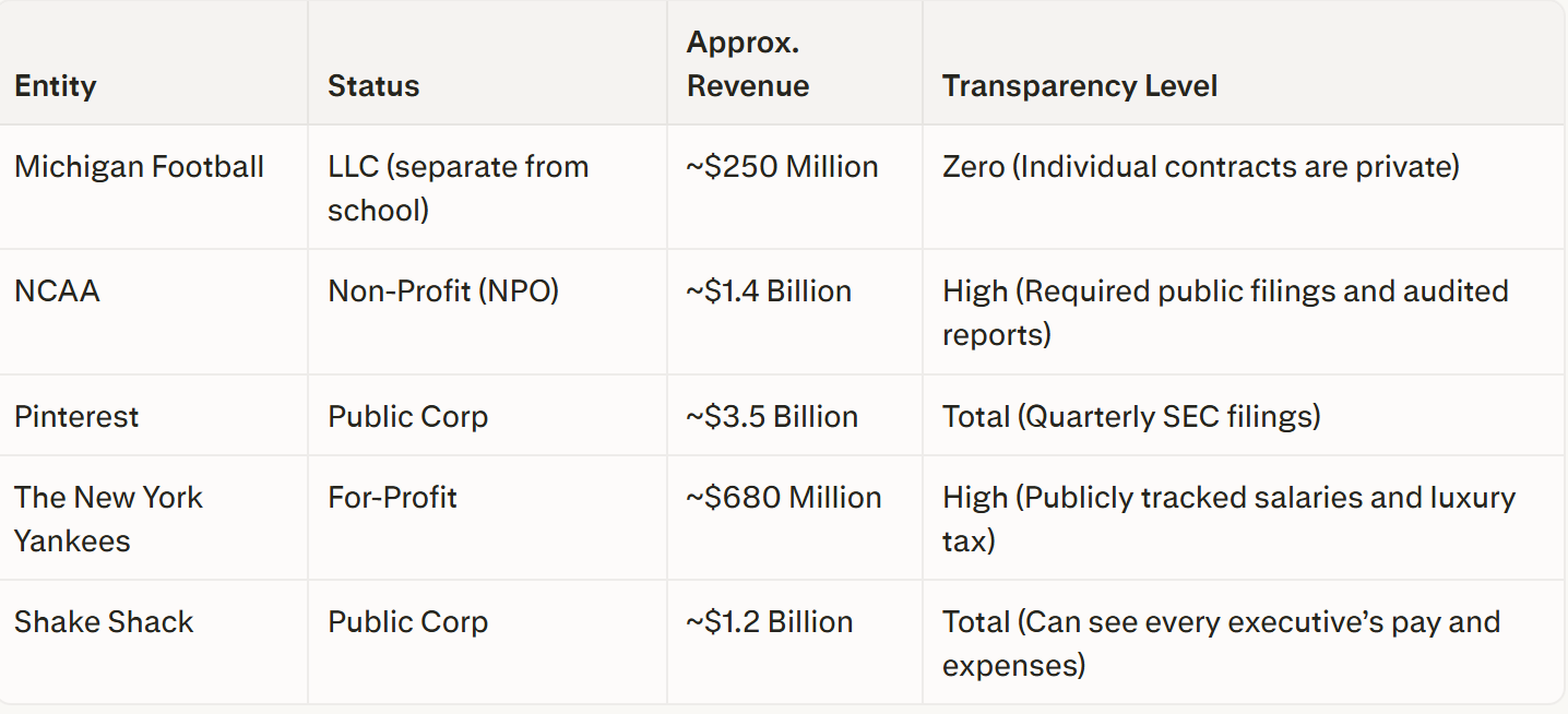 The fix is straightforward: NIL collectives should be legally classified as extensions of their universities, not independent entities. If the University of Michigan’s name, brand, and stadium are what make Bryce Underwood worth millions, then Michigan owns that contract, and Michigan should have to disclose it to the public.